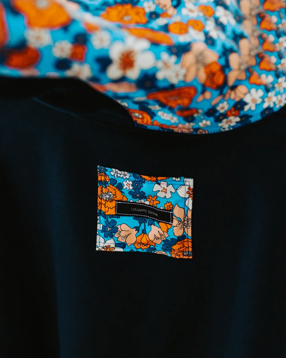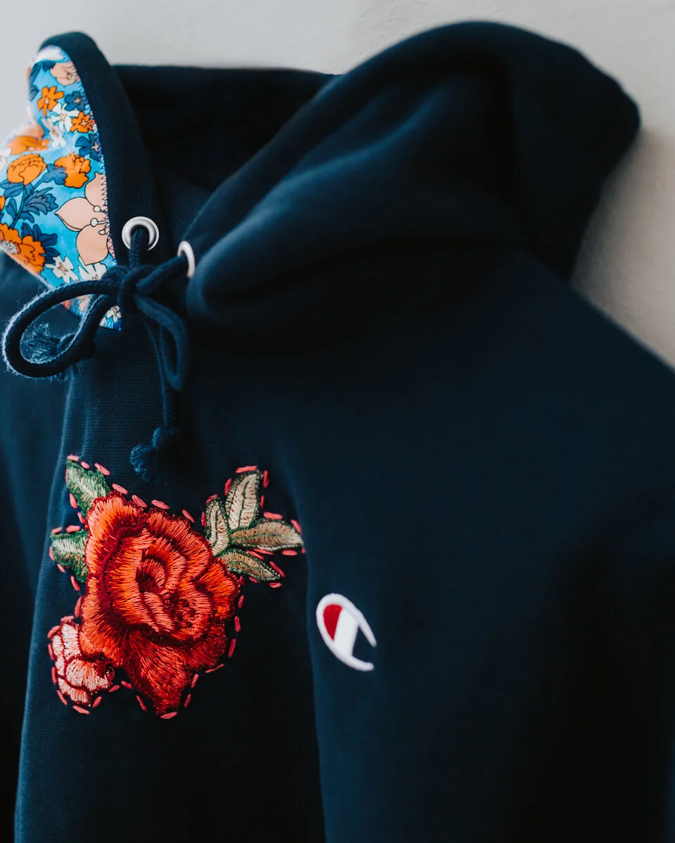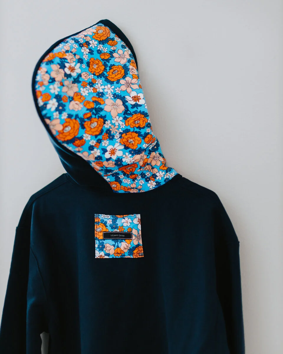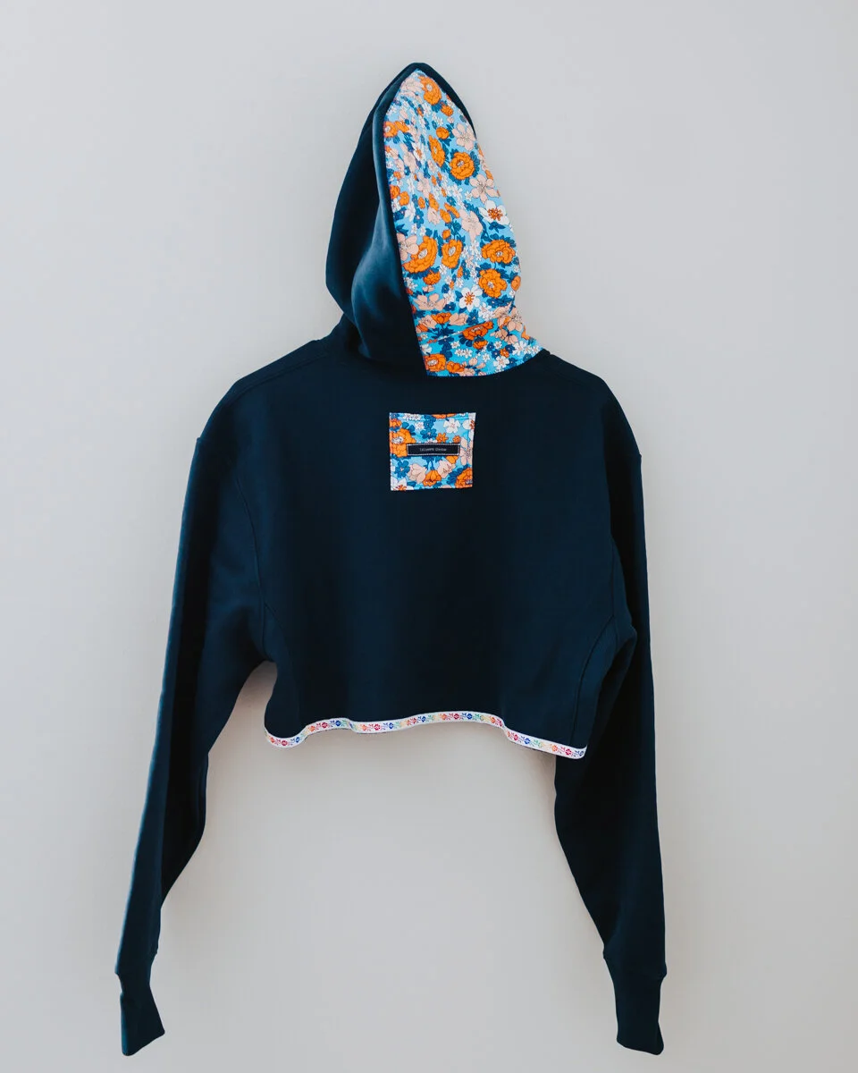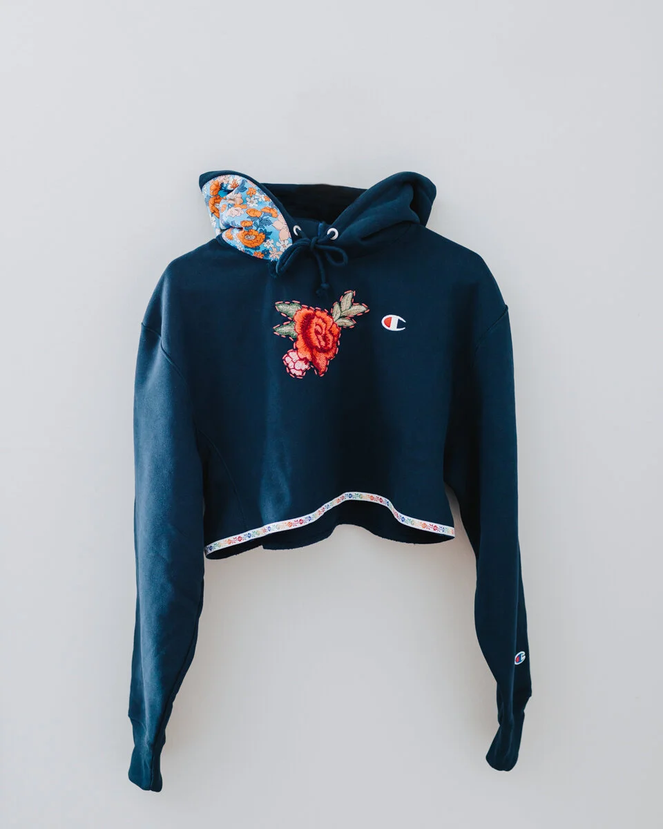 I made this cut off hoodie using my seemingly ever present floral themes. The commissioner of this piece requested UNC-Chapel Hill colors, which I was able to accomplish using a navy hoodie and Carolina blue fabric.